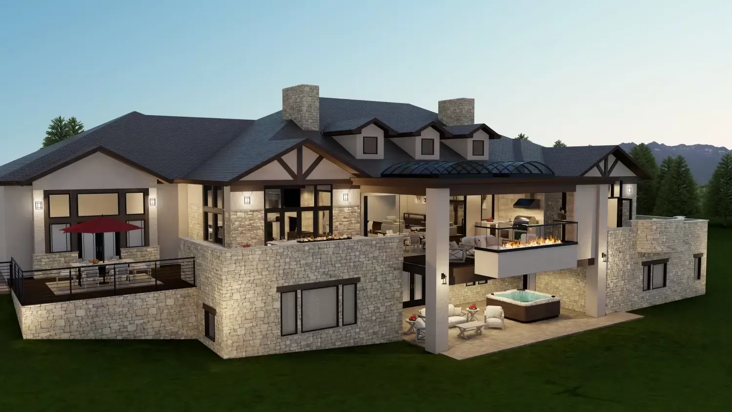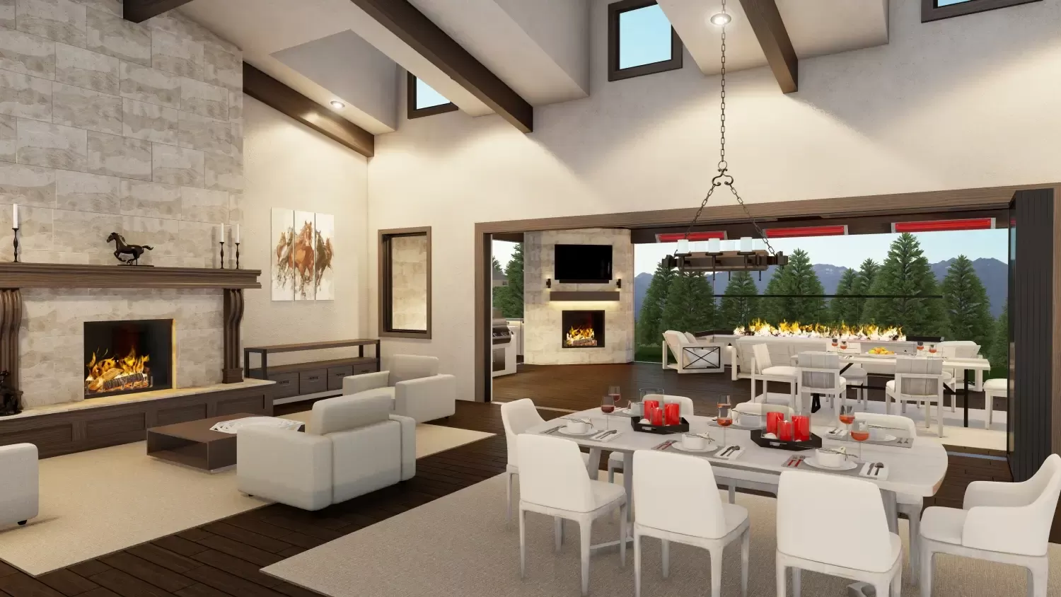 The highlight of this area is the signature fire feature that captures the home’s city skyline and mountain views in glass and fire.