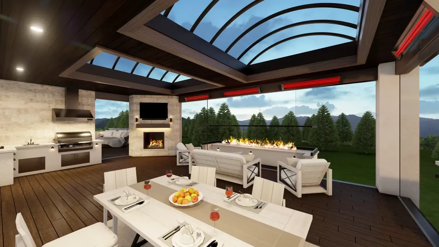 Next was creating a protected living area off the indoor living room. The home’s existing rooflines are a unique feature of the home so instead of removing the beautiful dormers, we added a flat roof with large custom round skylights to capture the drama of the night stars and everchanging clouds.