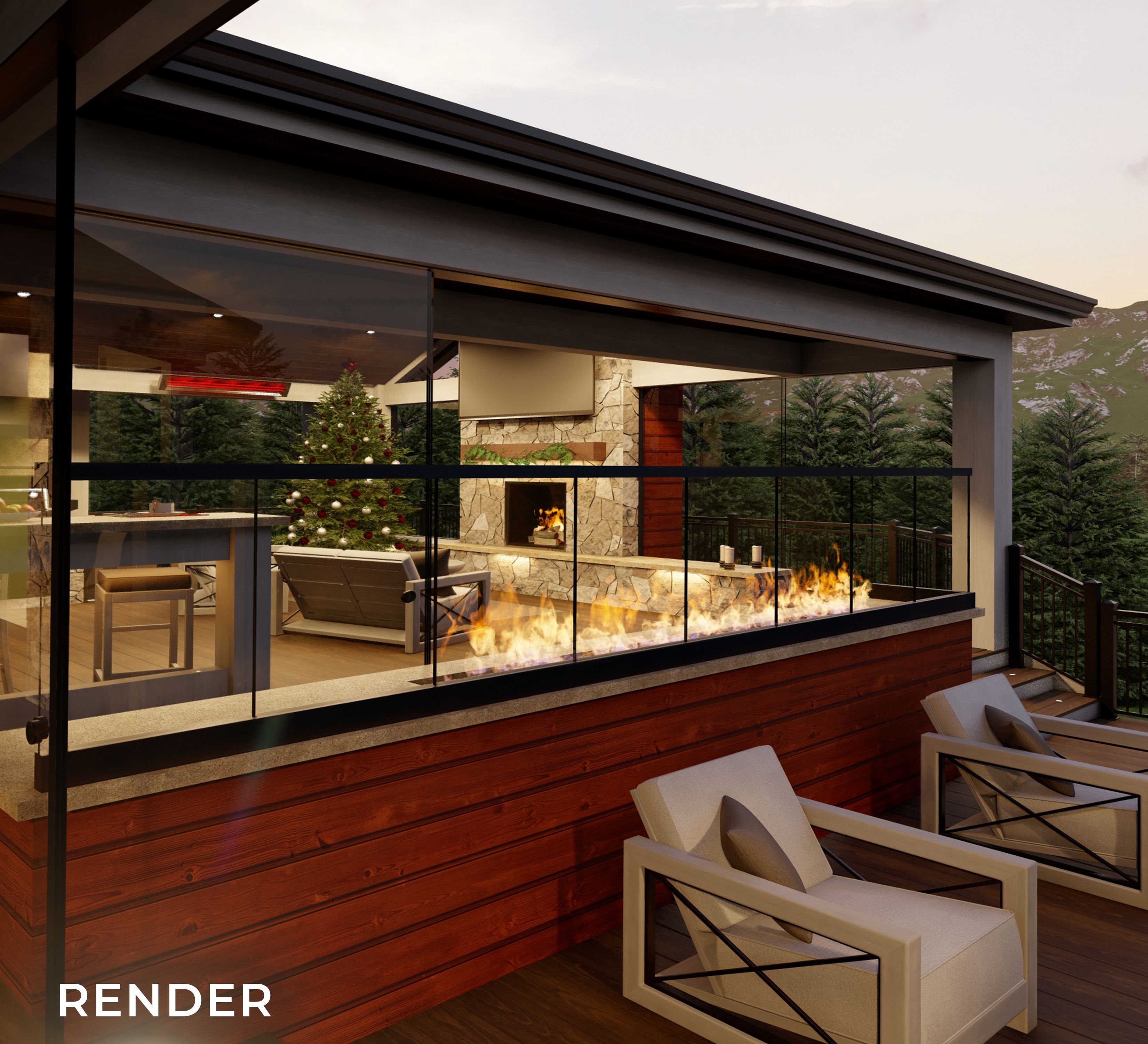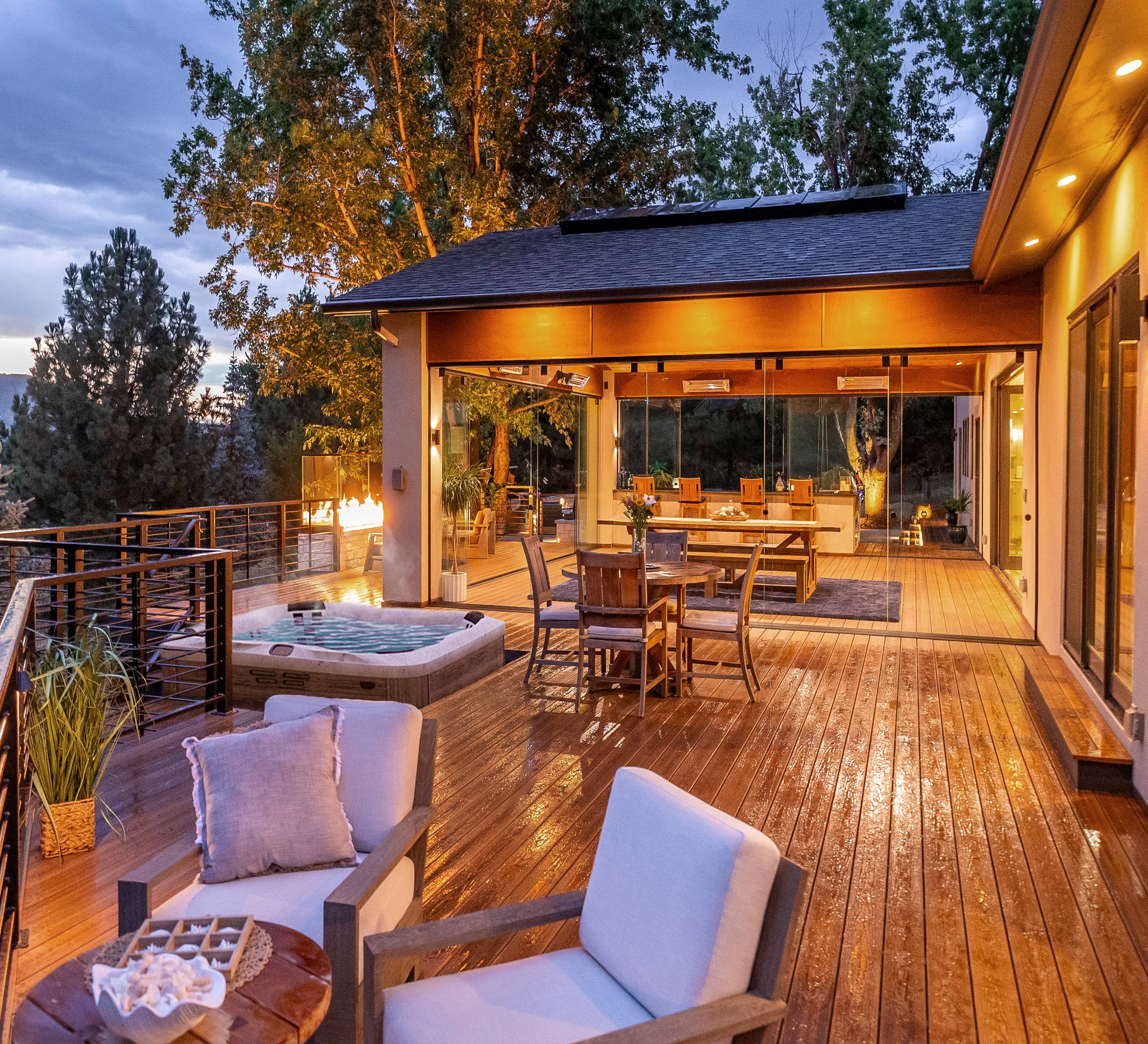 Our innovative designs ensure that your outdoor space is as functional in winter as it is in summer. With operable Clearview glass wind walls, your space is fully protected from wind, snow, and rain. These sleek, modern panels allow you to enjoy dinner outside, even during a blizzard. Pair that with our signature fire features—like elegant fire rails and cozy fire pits—and you’ll have the perfect gathering space for any occasion.