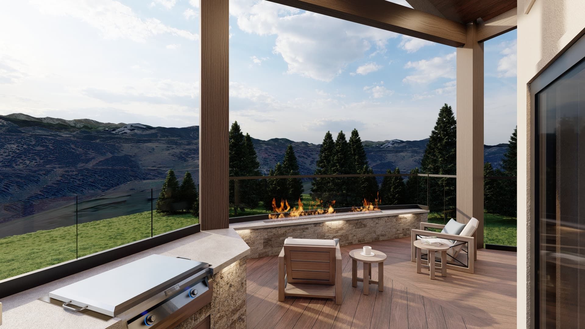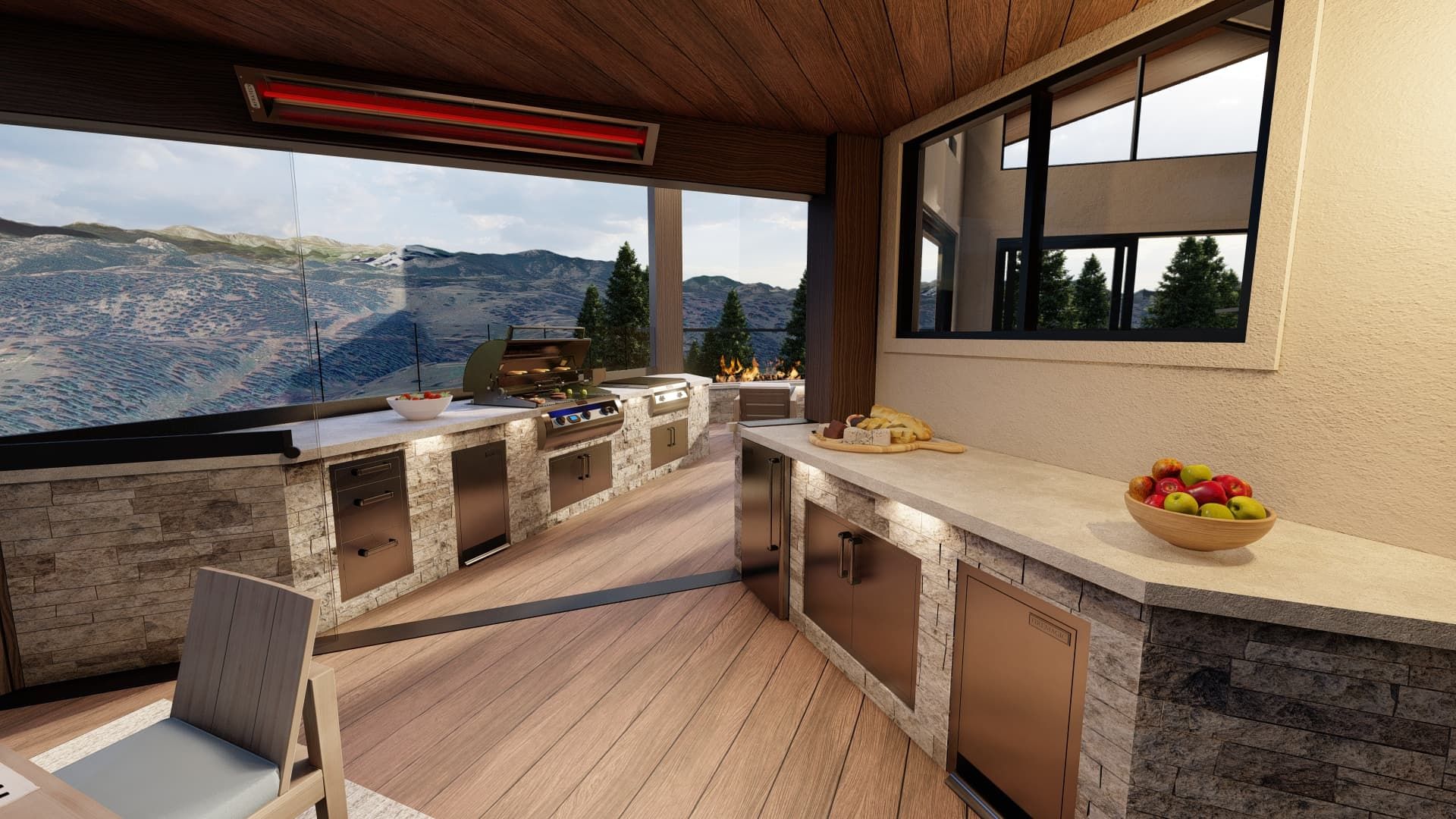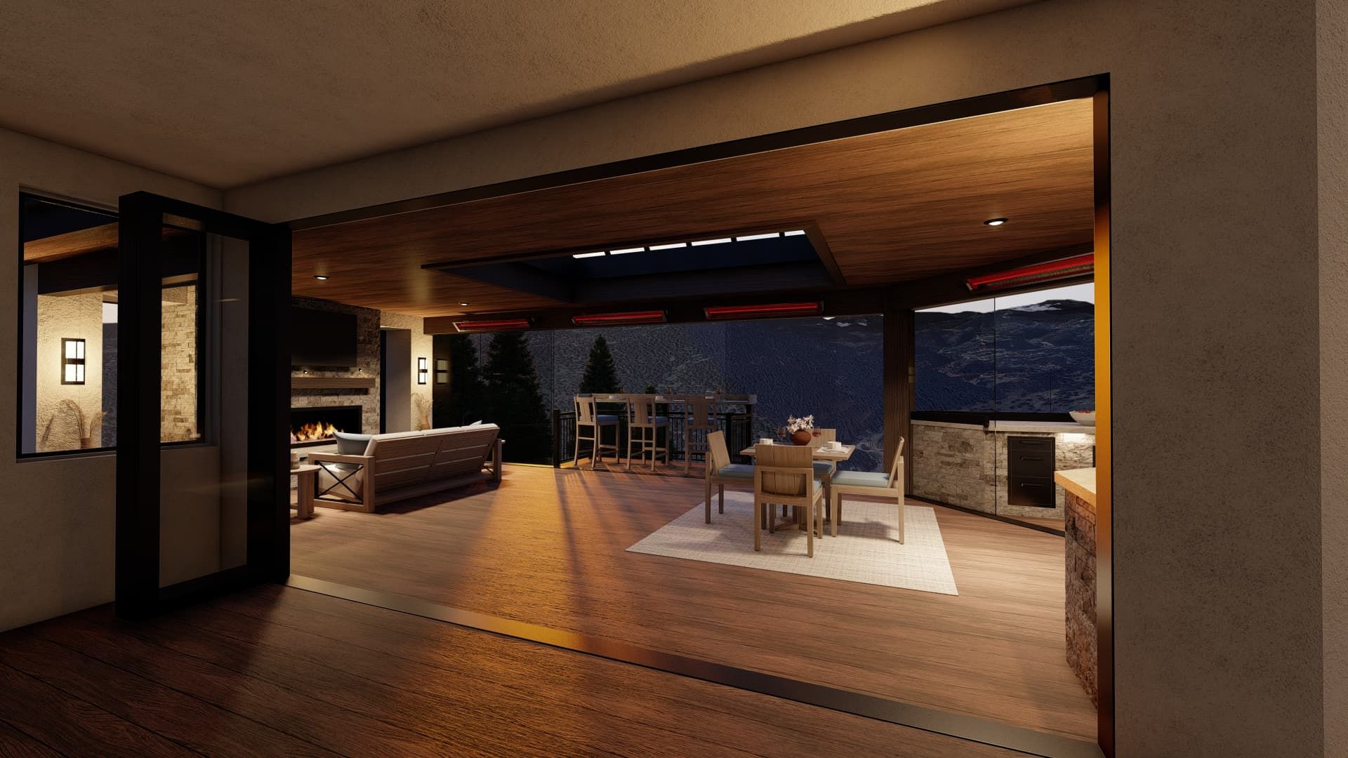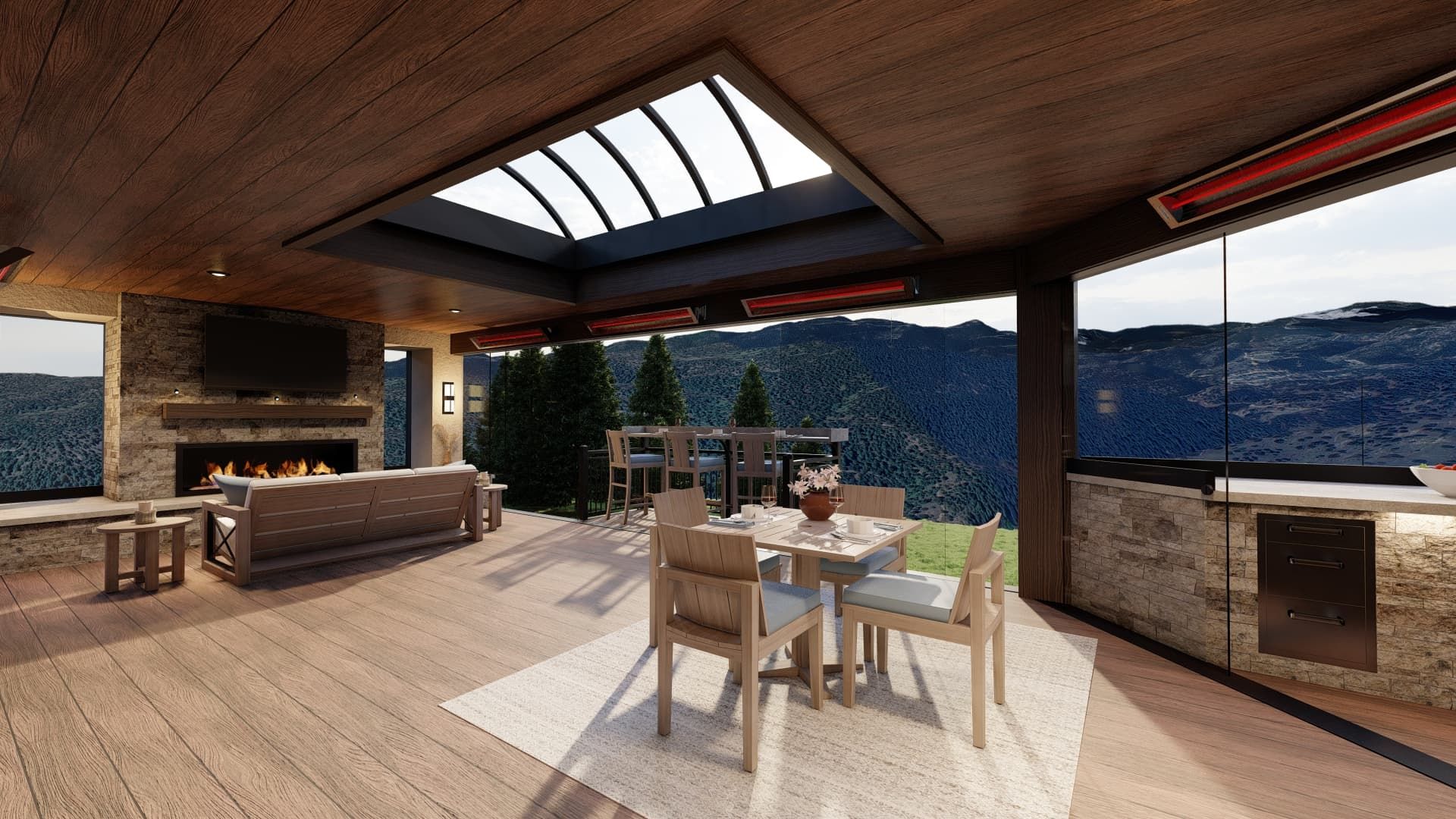 Perched high above Golden, this Outdoor Space is designed to frame the mountains as much as it is to enjoy them. A dramatic roofline and massive skylight bring the outdoors in, while Clearview Glass Walls protect from the wind without blocking a single view. Inside, a full outdoor kitchen with built-in appliances stretches across the space, paired with a cozy fireplace lounge and multiple areas for dining and gathering. A private hot tub corner and signature fire feature complete the layout—turning this once-simple deck into a four-season destination.