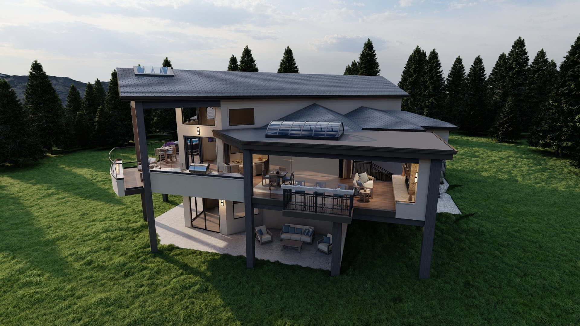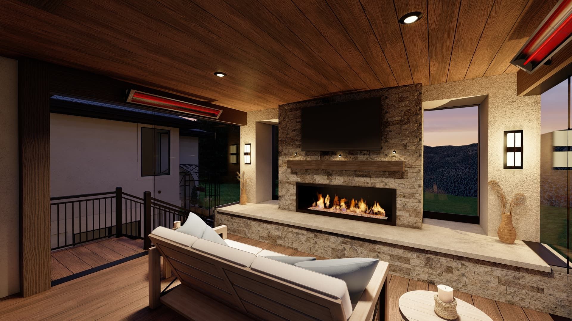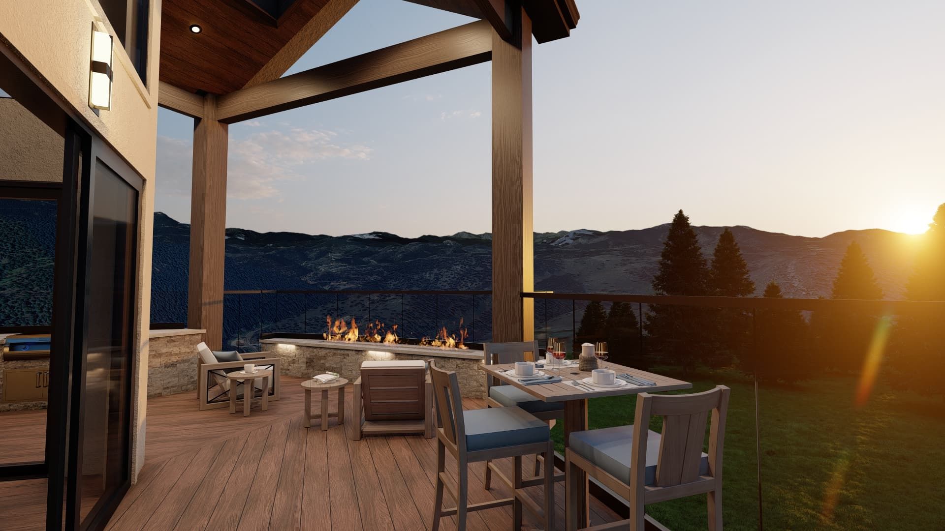 Perched high above Golden, this Outdoor Space is designed to frame the mountains as much as it is to enjoy them. A dramatic roofline and massive skylight bring the outdoors in, while Clearview Glass Walls protect from the wind without blocking a single view. Inside, a full outdoor kitchen with built-in appliances stretches across the space, paired with a cozy fireplace lounge and multiple areas for dining and gathering. A private hot tub corner and signature fire feature complete the layout—turning this once-simple deck into a four-season destination.