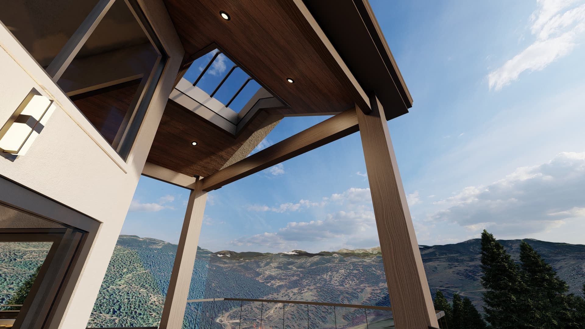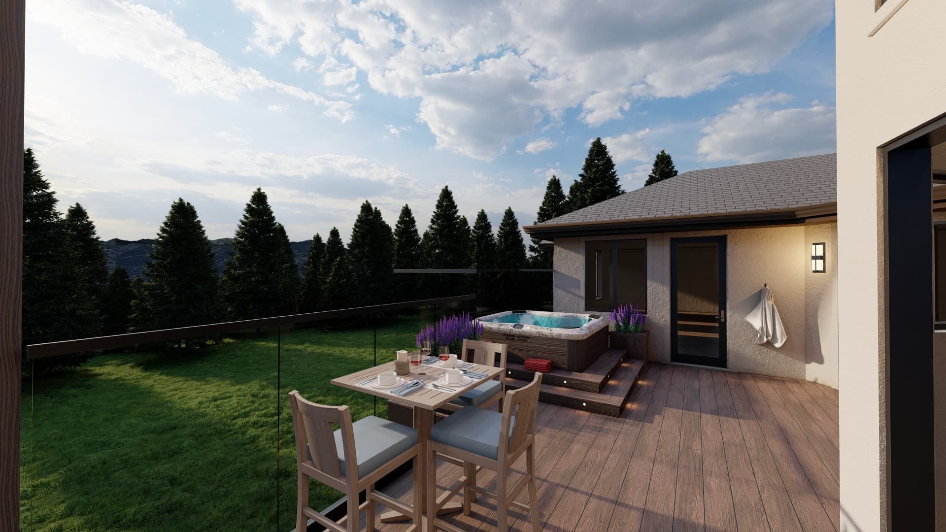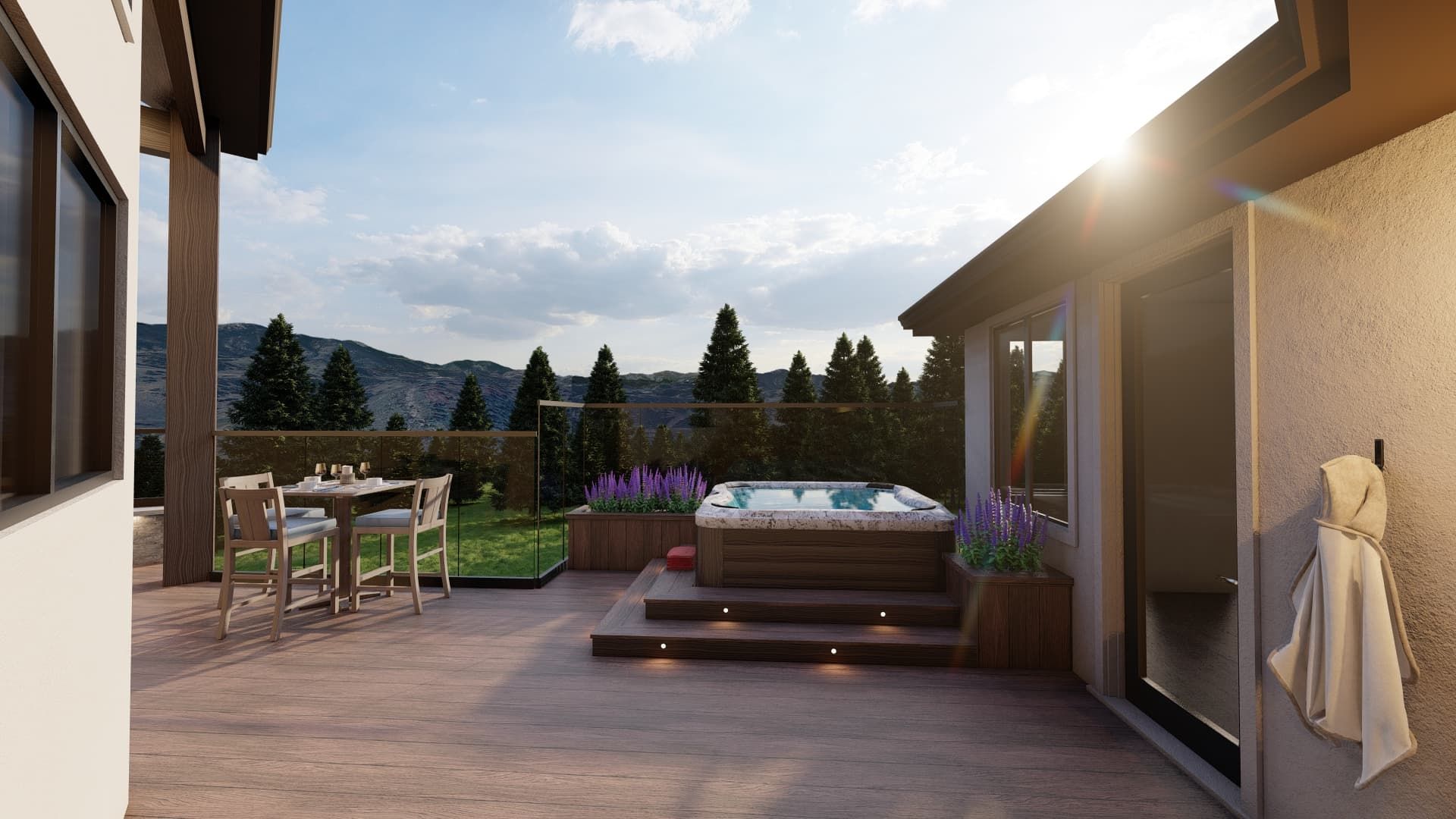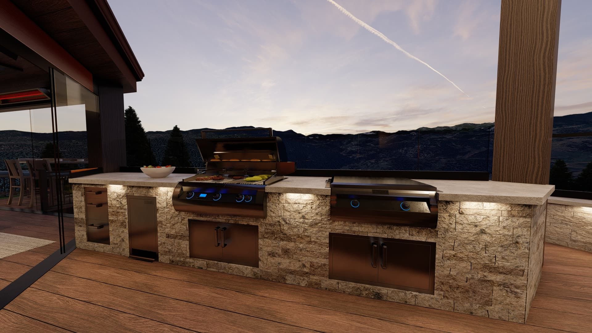 Perched high above Golden, this Outdoor Space is designed to frame the mountains as much as it is to enjoy them. A dramatic roofline and massive skylight bring the outdoors in, while Clearview Glass Walls protect from the wind without blocking a single view. Inside, a full outdoor kitchen with built-in appliances stretches across the space, paired with a cozy fireplace lounge and multiple areas for dining and gathering. A private hot tub corner and signature fire feature complete the layout—turning this once-simple deck into a four-season destination.