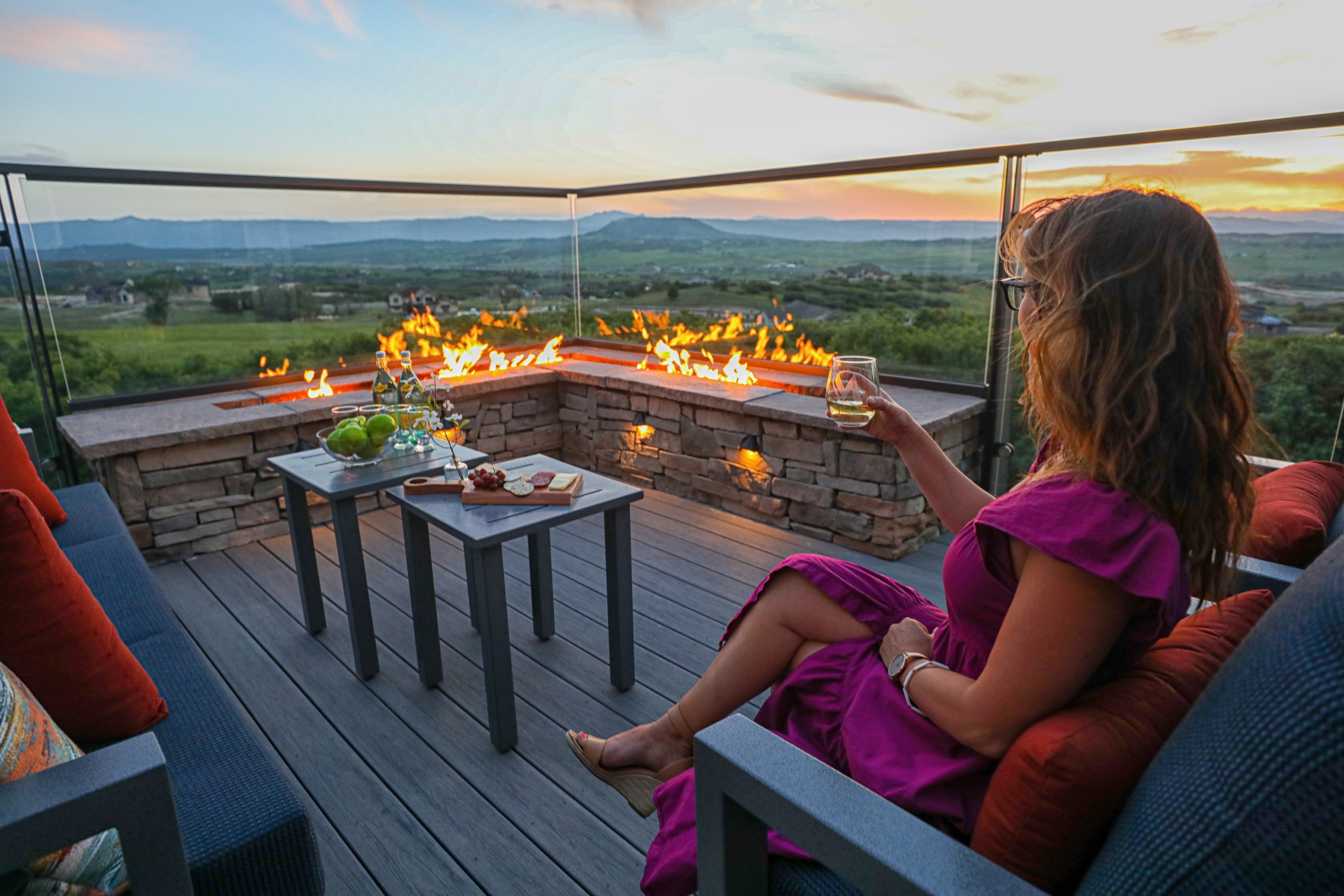 This home has incredible unobstructed views but wind and weather kept the homeowners from using their existing deck. By updating and refining the original space, the family can now enjoy the stunning vistas they fell in love with. Featuring glass walls, timber ceilings with a large skylight, and an infinity style corner fire feature, these clients can now enjoy this impressive Masterpiece every season of the year.
