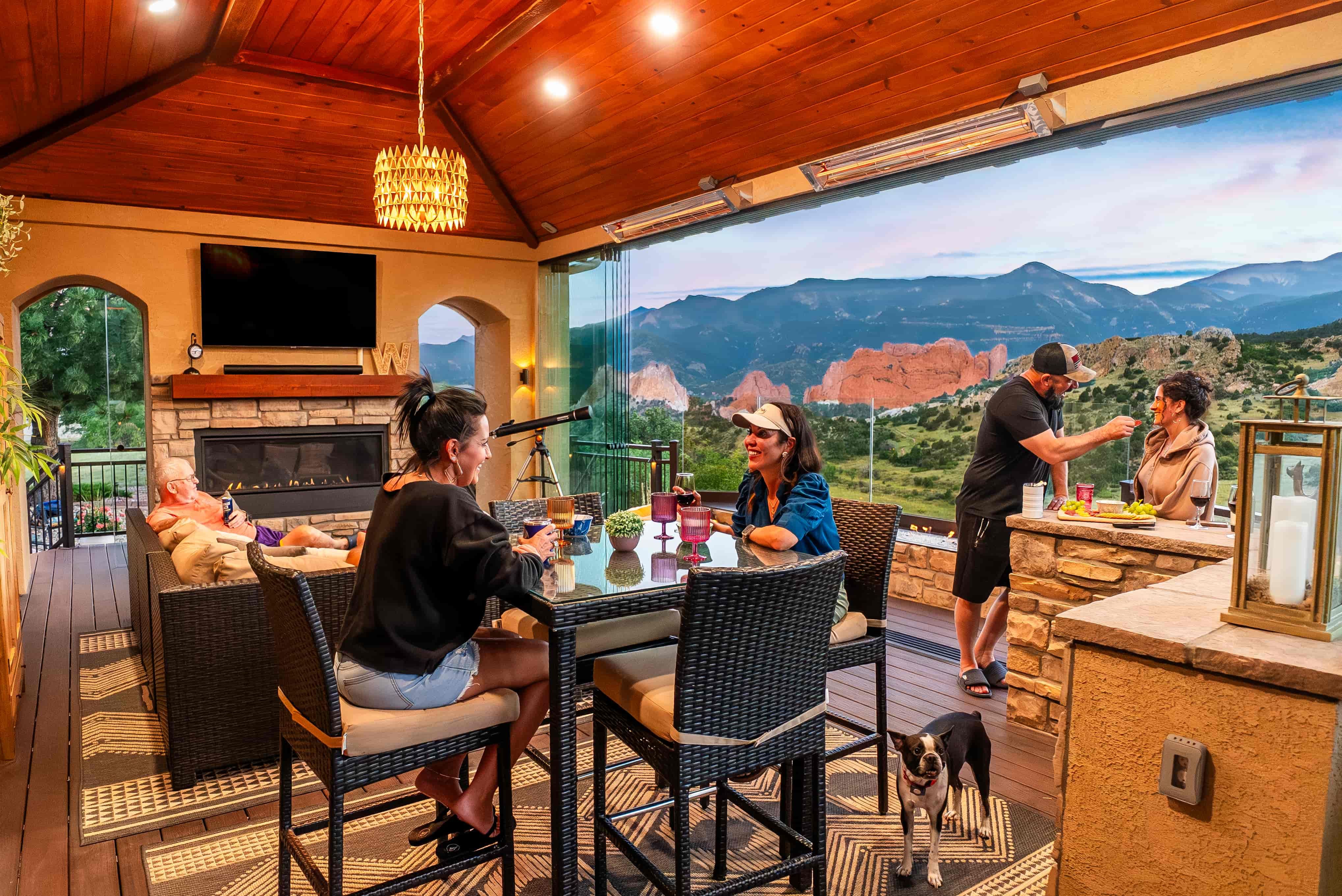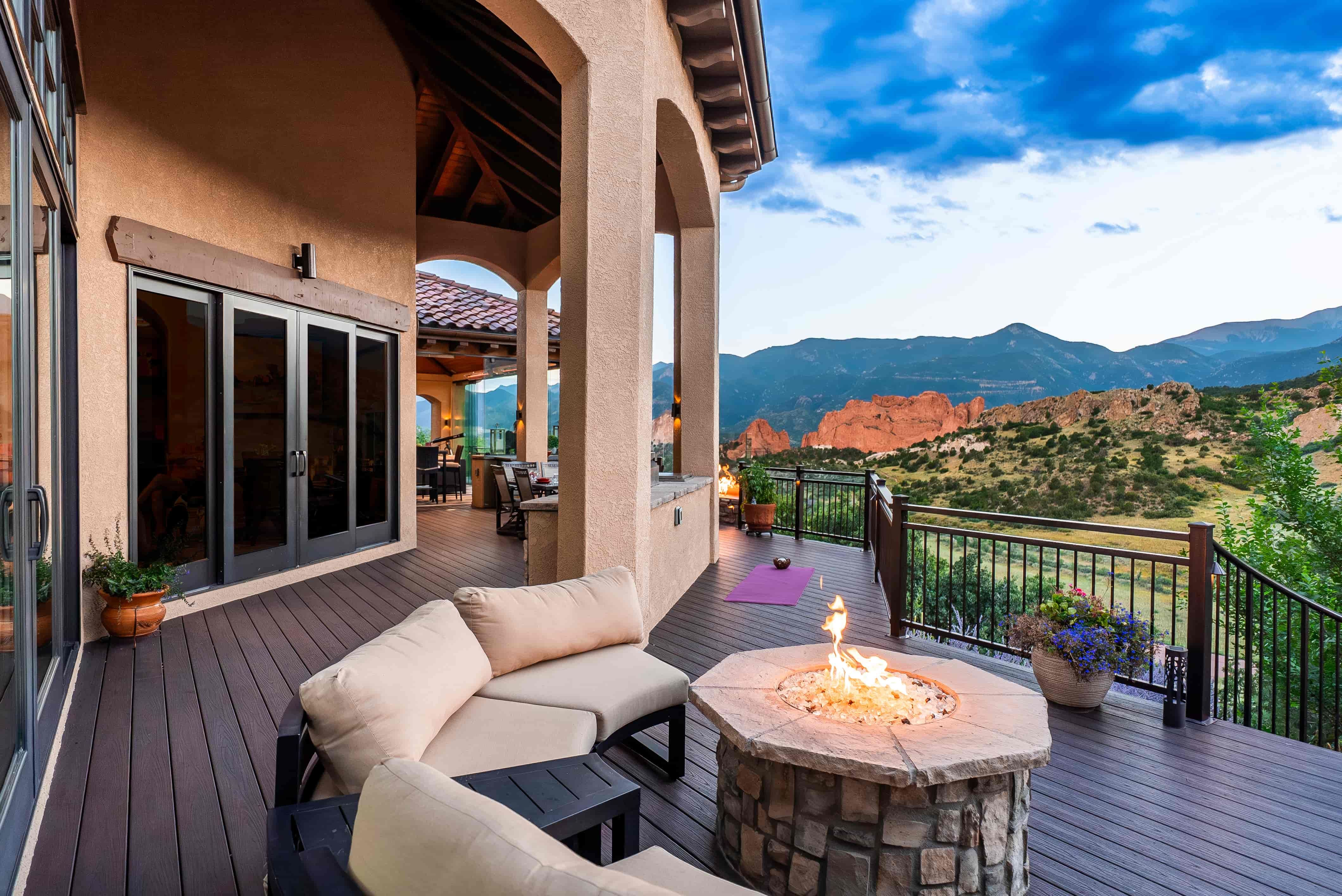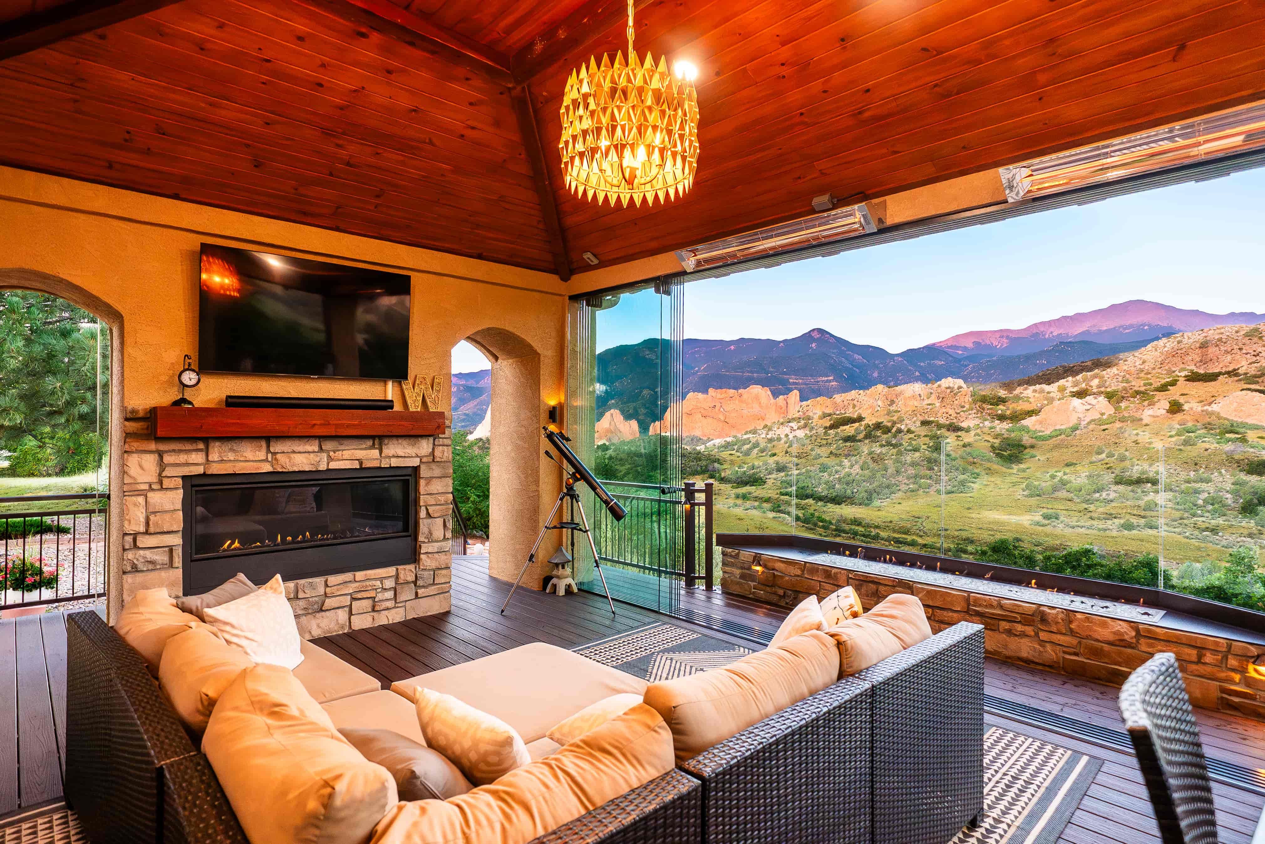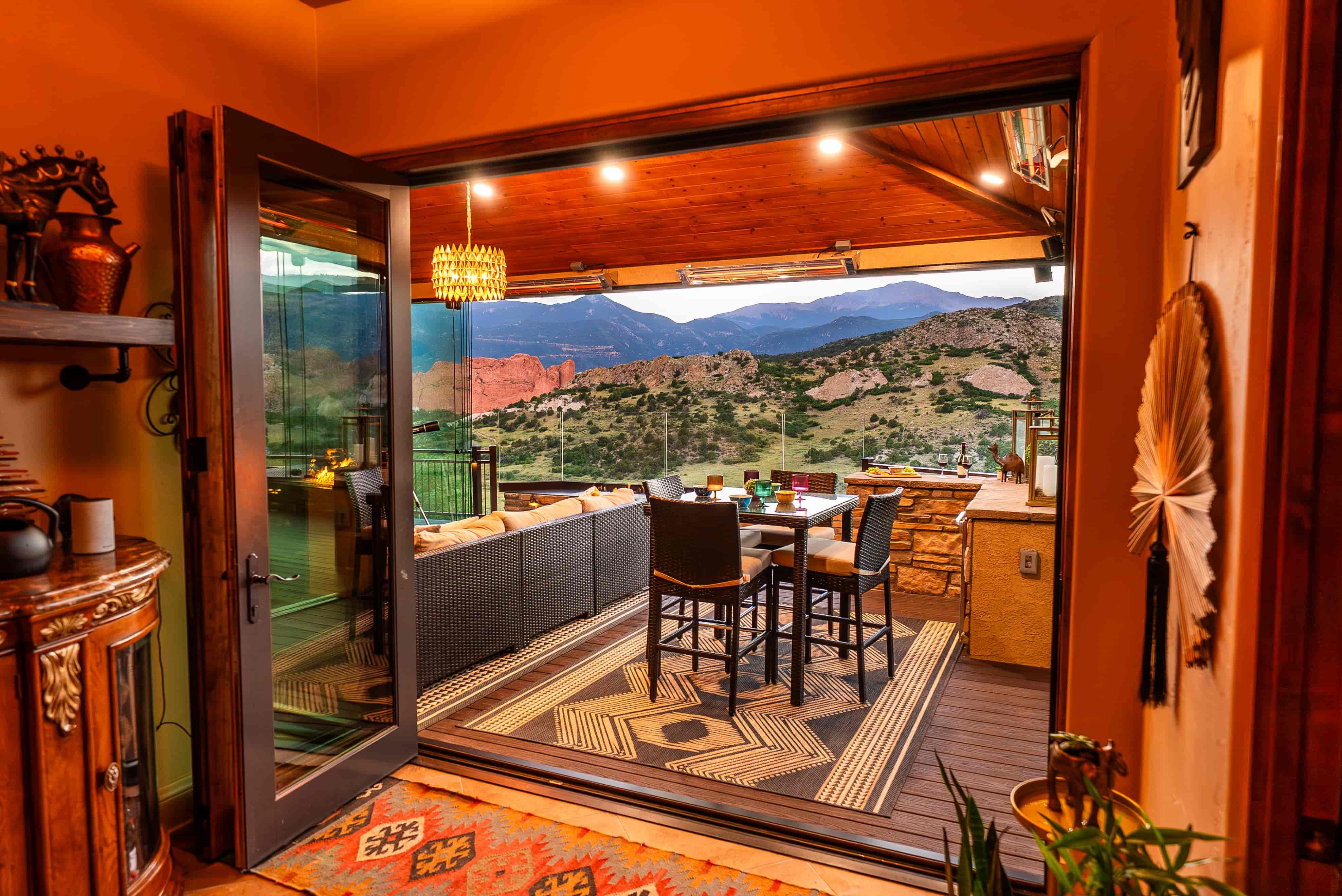 This beautiful Garden of the Gods home had a breathtaking view but lacked a way to enjoy it for a majority of the year. They needed a space that would amplify their view and create a warm and inviting area for soaking in the natural beauty of Colorado. By tearing out an existing interior wall and replacing it with a large, dramatic accordion door, we accomplished a seamless integration between their indoor and outdoor living areas. Their new custom Outdoor Space features a climate-controlled lounge area, multiple fire features, and full-glass walls to make this the perfect gathering place every day of the year.